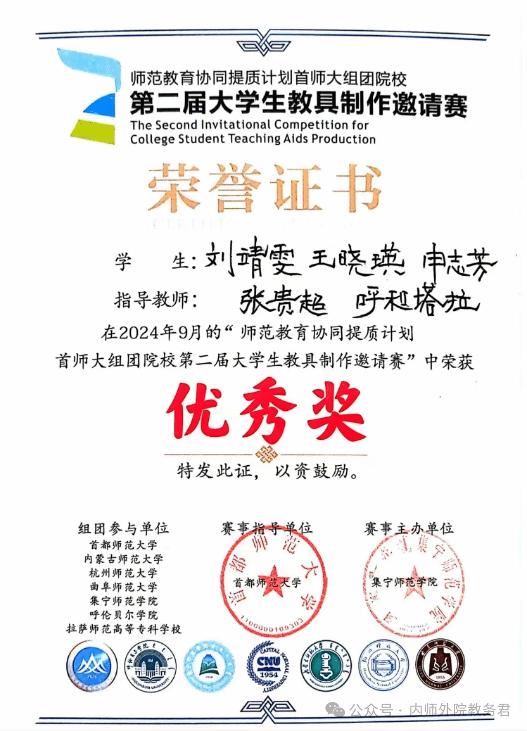 在刚刚落幕的“师范教育协同提质计划首师大团组院校第二届大学生教具制作邀请赛”中,代表yl6809永利检测中心参赛的22级英语一班的刘靖雯、王晓瑛、申志芳三位同学在复赛中充分展示了外院学子的良好风貌,作品“游转大世界”获得优秀奖。