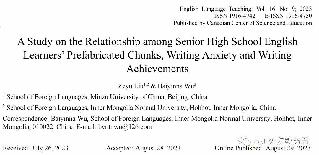 基于其本科毕业论文,在吴白音那老师的深入指导下,经过多稿修改,刘泽宇同学于2023年8月在加拿大学术期刊English Language Teaching 上成功发表题为“A Study on the Relationship among Senior High School English Learners’Prefabricated Chunks,Writing Anxiety and Writing Achievements”的学术论文,这是我院英语系本科生首次在国际期刊发表论文