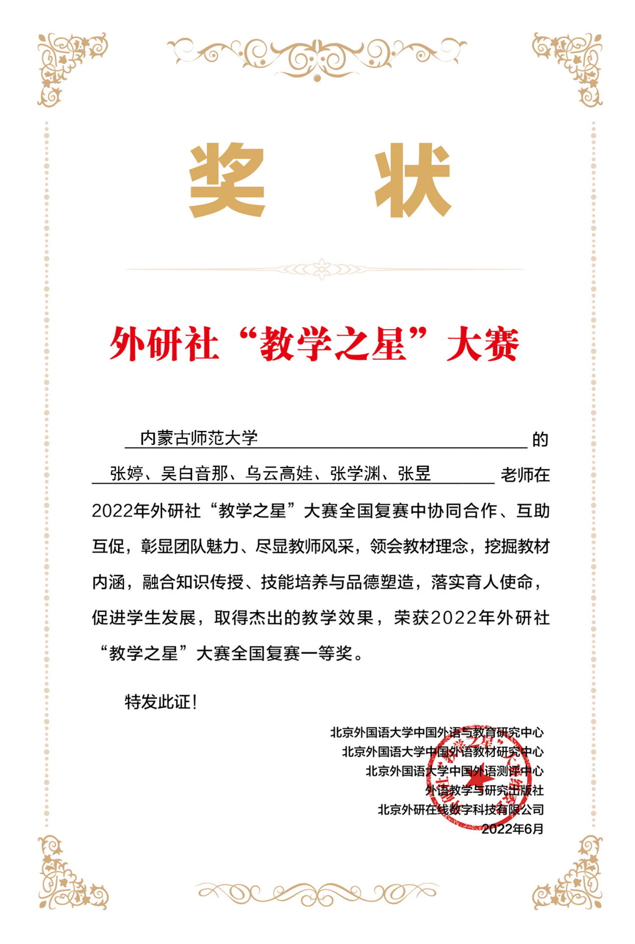 近日,我校yl6809永利检测中心英语系教学团队在2022年外研社“教学之星”大赛全国复赛中再获佳绩。本次参赛团队由张婷、吴白音那、乌云高娃、张学渊、张昱五位老师组成,团队充分发挥集体智慧,群策群力,厚积薄发,在比赛中荣获全国复赛英语专业组一等奖,这也是“教学之星”大赛改为团队赛制后,英语系教师团队连续第二年在本项赛事中荣获佳绩。