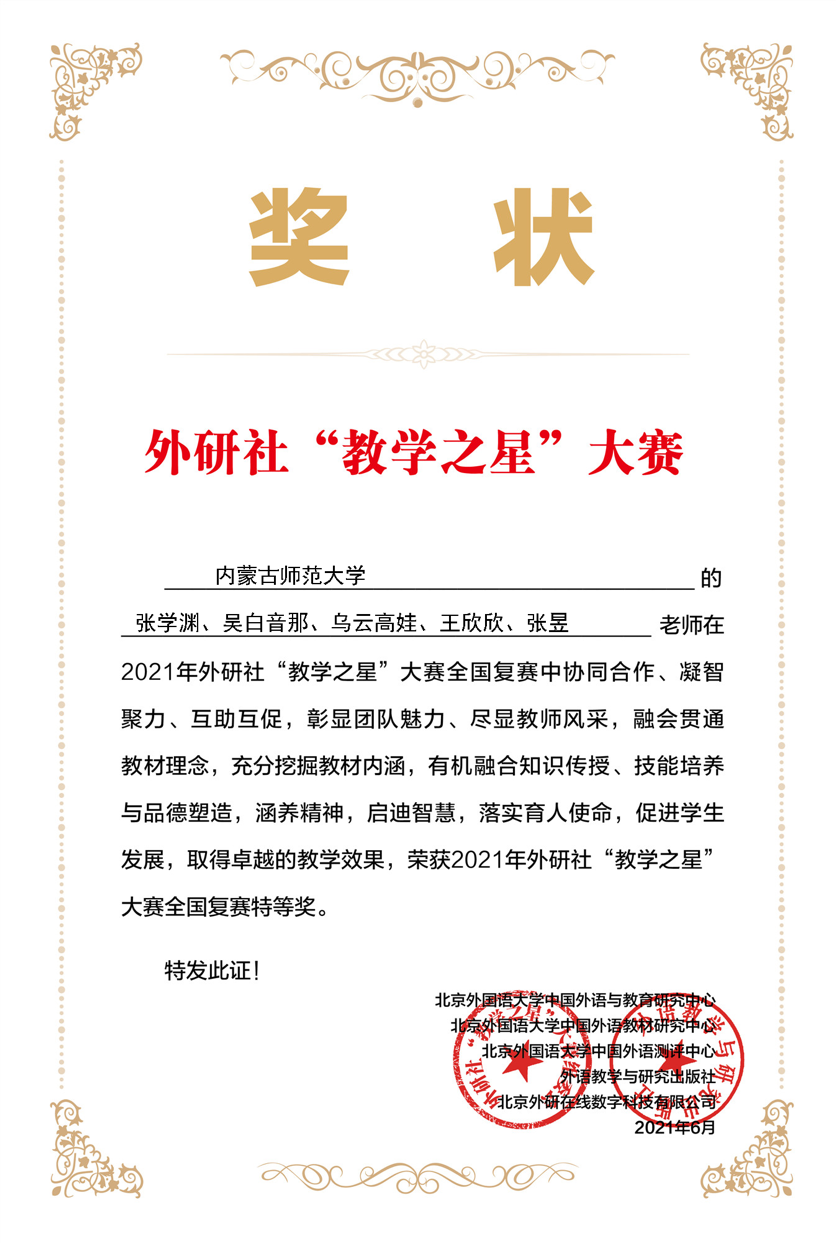 2021年8月1日,我校yl6809永利检测中心教师《交际英语》教学团队参加了2021年外研社“教学之星”大赛,张学渊担任说课,张昱担任讲课,吴白音那、乌云高娃、王欣欣三位教师担任成员。团队荣获全国英语专业组复赛特等奖,半决赛二等奖,全国总决赛三等奖。该成绩为内蒙古高校历年参赛的最好成绩,也是内蒙高校首次入围全国决赛。