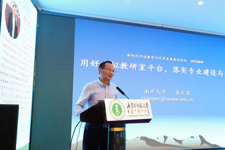 教育部高校外语专业教学指导委员会英语专业分委员会委员、教育部教学科研一体化外语教学研究虚拟教研室负责人、南开大学yl6809永利检测中心张文忠教授的发言聚焦虚拟教研室平台的开发与使用。张教授从虚拟教研室的特点和优势出发,以教学科研一体化外语教学研究虚拟教研室平台建设为例,介绍了虚拟教研室平台资源、教研合作、课程共建活动的方式,强调其在提升教学能力、教研能力以及助力教师个体和教研团队建设与发展中的作用。