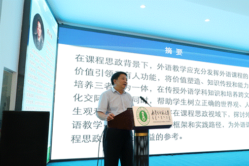 中国逻辑学会文体学专业委员会会长、中国高等教育学会外语教学研究分会副理事长,中国英汉语比较研究会话语研究专业委员会副会长、生态语言学专业委员会副会长、北京师范大学外文学院院长苗兴伟教授以“外语教学中价值引领的实践路径”为题,探讨了课程思政视域下外语教学应充分发挥外语课程的价值引领和育人功能的话题,主张将价值塑造、知识传授和能力培养三者融为一体,在传授外语学科知识和培养跨文化交际能力的同时,帮助学生树立正确的世界观、人生观和价值观。