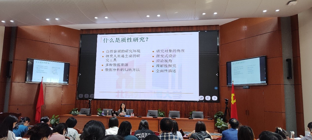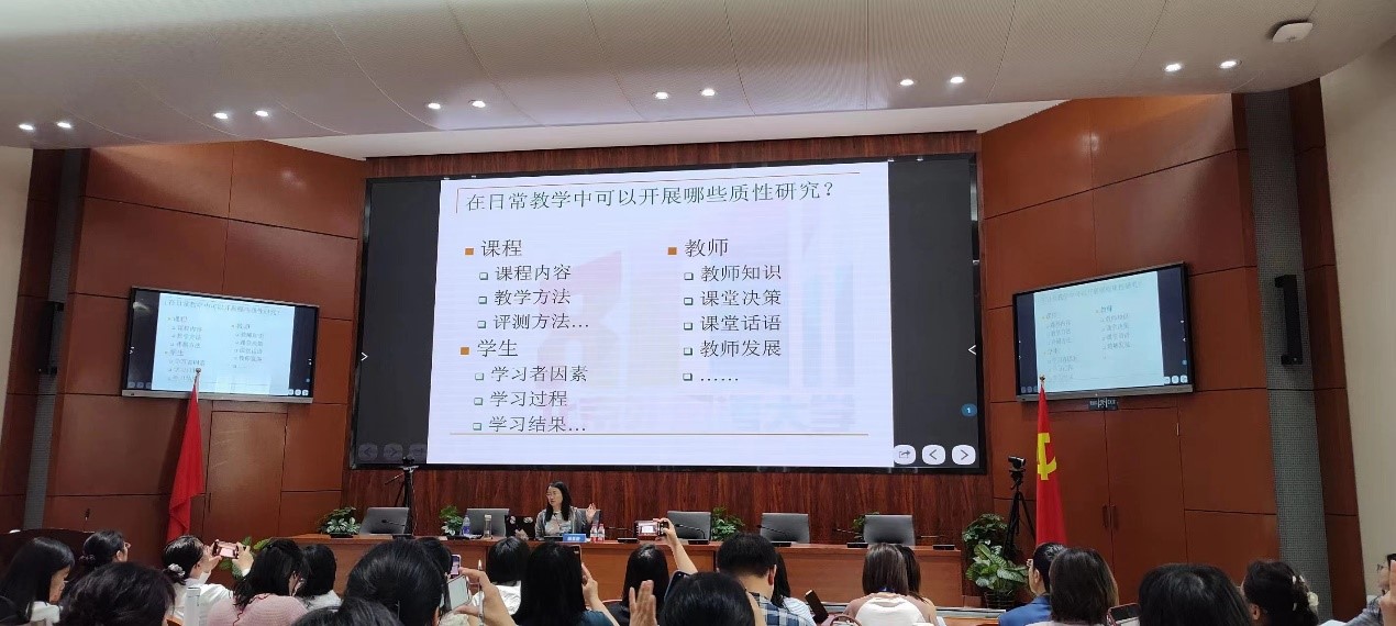 5月28日,北京外国语大学国际教育学院副院长、中国外语与教育研究中心杨鲁新教授带来题为“质性研究方法与论文写作”的研修讲座。杨教授开门见山,简明扼要地介绍了质性研究的定义和使用场景。随后,杨教授与研修学员进行了亲切的学术互动,以研修教师的实际问题为例,阐明质性研究的适用性,进而讲解了质性研究的主要类型和具体要求。以个案研究为例,辅以深刻的案例剖析,杨教授还深入讲解了质性研究论文的撰写方法和流程。此外,杨教授还对质性研究数据收集、分析编码与理论提炼进行了深入探讨。讲座的最后,杨教授对研修学员提出的具体问题进行了细致的解答。