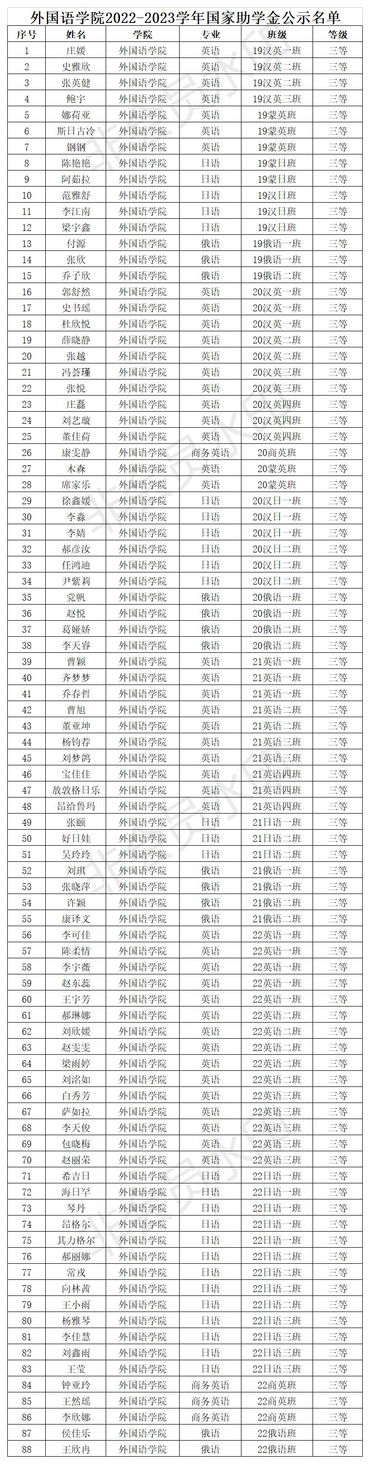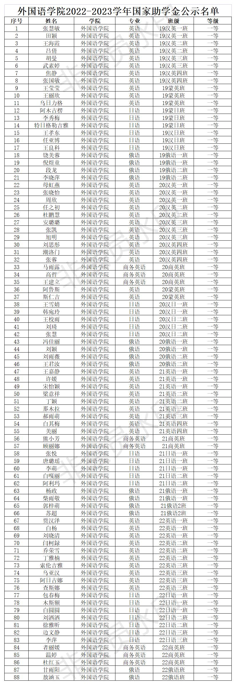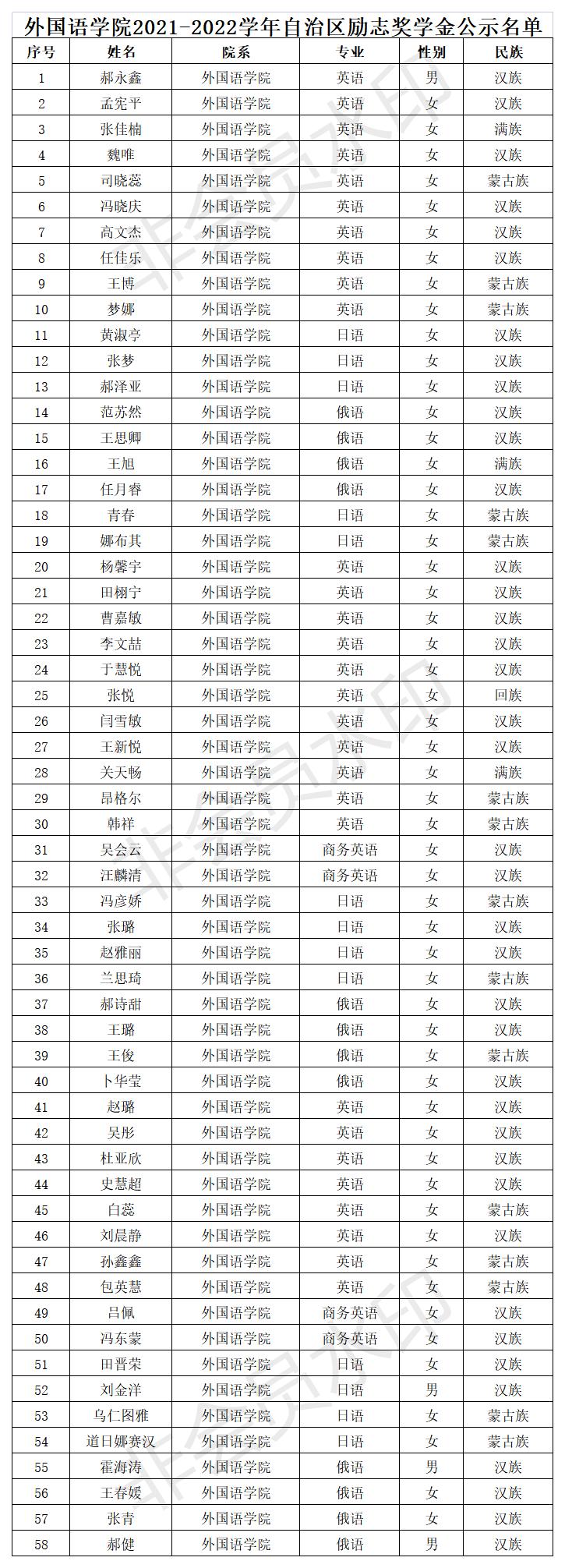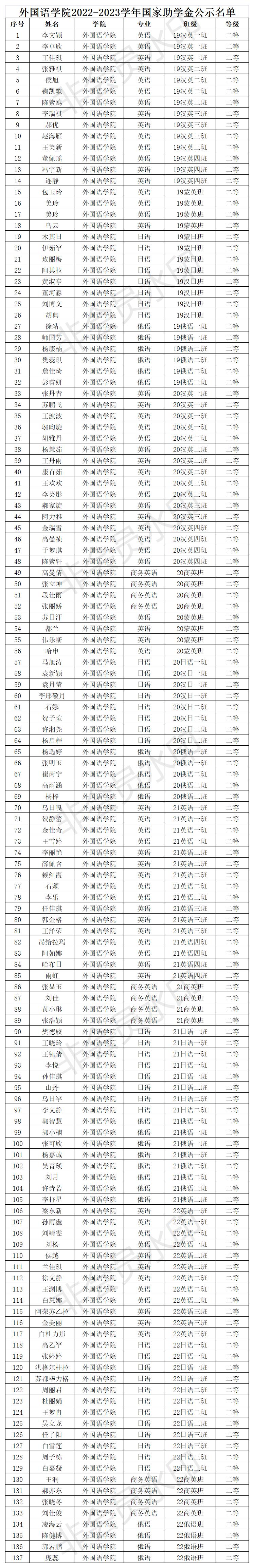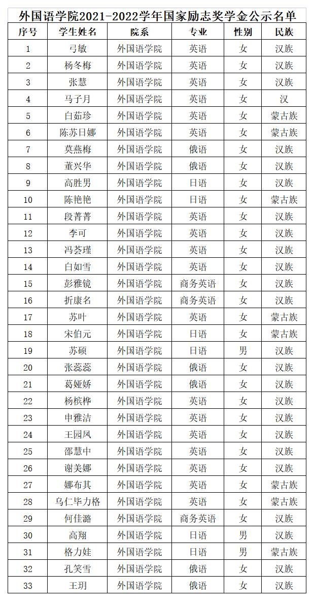 根据关于印发《永利官网国家励志奖学金、国家助学金评选管理暂行办法》的通知(校发〔2015〕73号),《关于印发<永利官网自治区励志奖学金评选暂行办法>的通知》(内师校发〔2021〕66 号),《关于开展 2021-2022 学年自治区励志奖学金评审工作的通知》(校学发〔2022〕19 号),以及《关于开展 2021-2022 学年国家励志奖学金、2022-2023 学年国家助学金评审工作的通知》(校学发〔2022〕17 号)等文件精神,我院组织开展了评选工作。经学生本人申请、班级评审小组审核、班主任审核、学院评审委员会评选,最终确定拟推荐人选名单(国家励志奖学金33人,自治区励志奖学金58人,国家助学金一等88人、二等137人、三等88人)。为体现公开、公平、公正的原则,现将拟推荐名单予以公示3天。如有异议,请来电或来信反映。