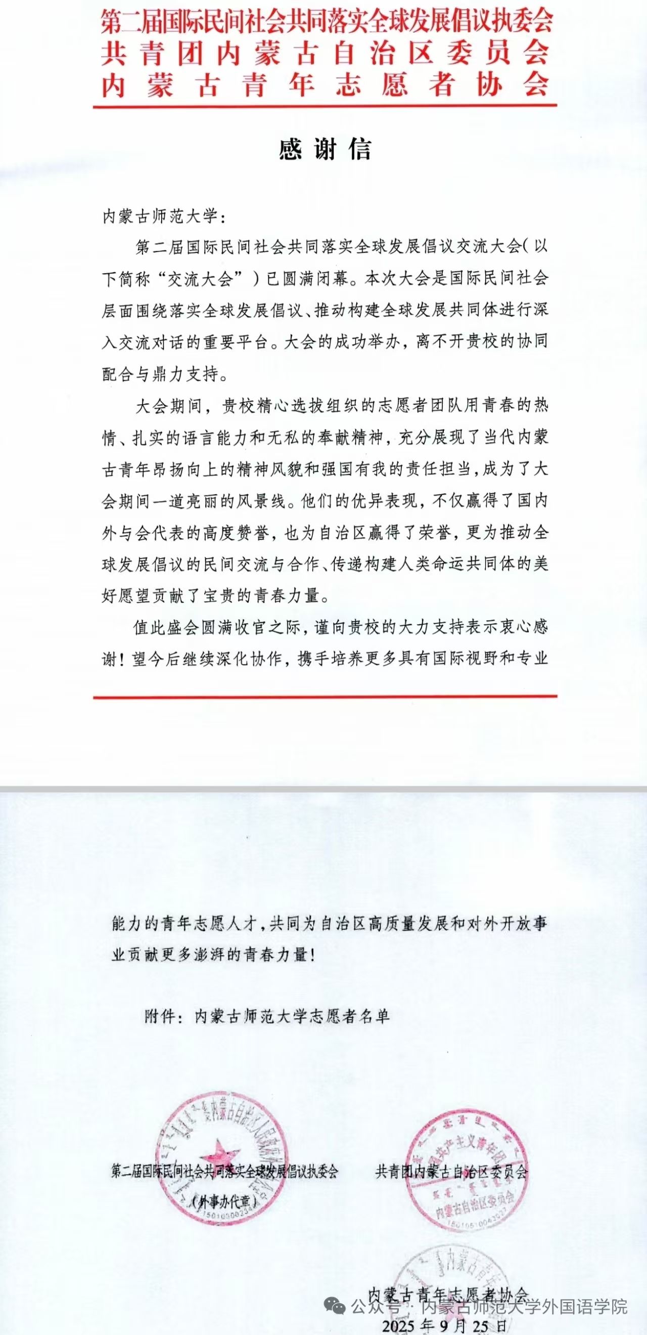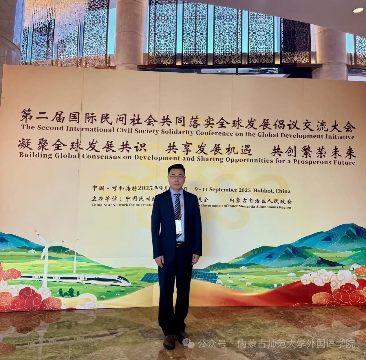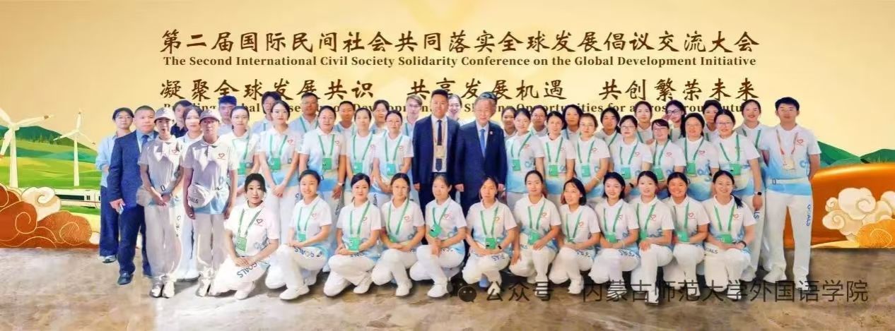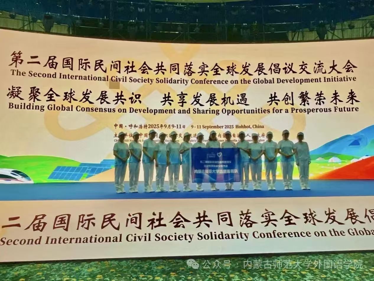 9月9日至11日,第二届国际民间社会共同落实全球发展倡议交流大会在呼和浩特召开,近50个国家代表参会。学院英语系14名师生提前4天投入服务,经服务规范、急救技能等系统化培训后,负责会议现场服务、多语种翻译、来宾接待等核心任务,获国内外代表广泛赞誉。