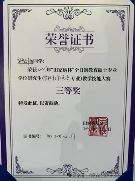 同学在本次比赛中均获三等奖!这一成绩不仅是对我院学科教学(英语)专业学位研究生培养成效的有力印证,更彰显了学院在人才培养道路上