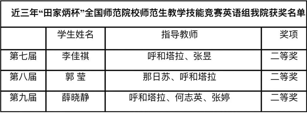 我校一直高度重视师范生技能比赛,从初赛到决赛给予了选手们大力的支持和保障。我院英语系在组织院赛后,成立了国赛指导教师团队,对国赛候选人进行了层层选拔,呼和塔拉、何志英、张婷三位指导老师根据选手的特点,细化备赛方案,有的放矢,对选手进行多轮次的教学指导及磨课训练。近年来,我院英语师范生技能比赛成绩不断突破,充分展现了我院教师的专业指导能力和师范生扎实的教学基本功。在今后的教学中,学院将继续优化师范生教学技能训练的过程性指导,对学生教学基本素质和关键能力进行重点培养,”以赛促训,以赛促教,以赛促学,以赛促就”,继续提升我院人才培养质量。