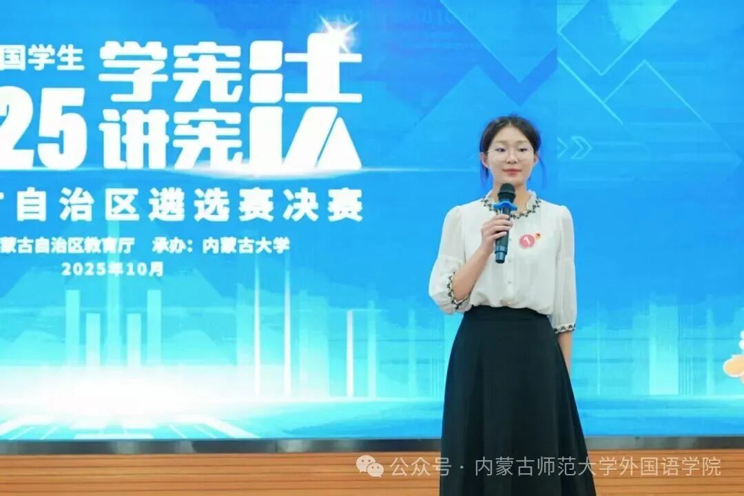 10月19日,第十届全国学生“学宪法 讲宪法”活动内蒙古自治区遴选赛决赛在内蒙古大学举办。经过激烈角逐,我院2025级英语二班李妍坤同学表现优异,荣获高校组演讲比赛三等奖。本次大赛由自治区教育厅主办,涵盖全区12个盟市、34所高校的150名选手。经前期选拔,26名选手晋级决赛。赛事规格高、竞争激烈,充分展现了全区青少年法治教育的丰硕成果。