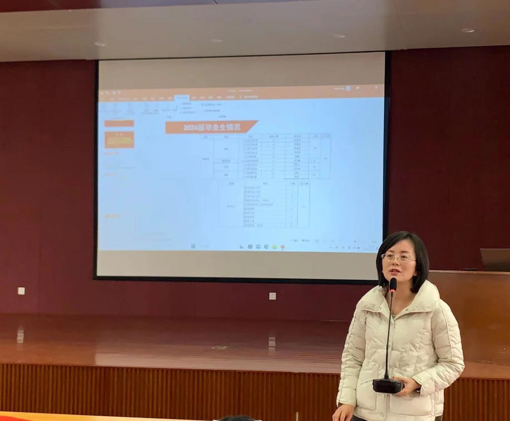 我院副书记、副院长王丹通报了2023届毕业生就业情况以及就业奖励实施办法,感谢所有为学院就业创业工作付出努力和给予帮助的老师们,2023届毕业生的就业业绩是全院教工上下同心共同努力的结果。同时,王丹传达了校党委书记李树林、党委副书记、校长张军在永利官网2024届毕业生就业工作动员大会的讲话精神,并在认真梳理总结就业工作经验的基础上,安排部署了2024届毕业生就业工作。学院党委始终高度重视毕业生就业创业工作,我院2024届毕业生421人,基数大任务重,全院教职工还要继续协同努力、多方发力,助力2024届毕业生多渠道高质量就业。