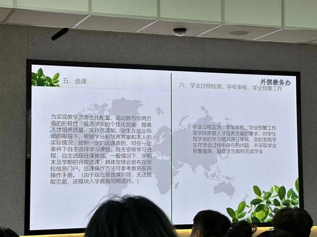 我院教务办白杰老师为大家解读了本科教务管理相关工作,包括在校期间需要修读的课程设置、课时安排以及选修类型。同时也对大学四年需要达到的学分情况做了详细介绍。