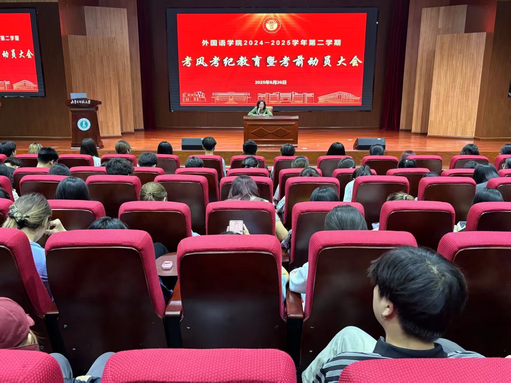 6月26日,我院在图书馆二楼报告厅召开2024-2025学年度第二学期考风考纪教育暨考前动员大会,会议由我院党委副书记、副院长李艳茹主持。
