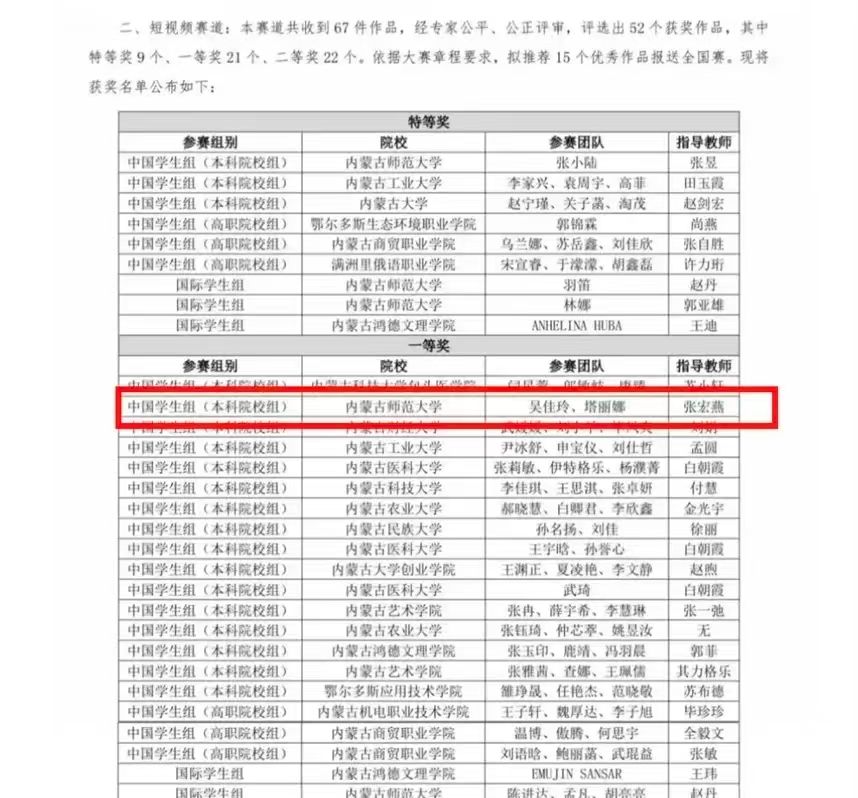 近日,第八届“外研社杯”全国高校学生跨文化能力短视频大赛赛果公布,永利官网学生制作的短视频作品均斩获佳绩。其中,内师大yl6809永利检测中心学生吴佳玲和塔丽娜同学的作品《中华文化的千年絮语:从指尖到世界》斩获大赛内蒙古赛区一等奖,全国赛二等奖。本次大赛于2025年3月启动,吸引了来自全国31个省、自治区直辖市共1050所高校3000多名学生积极参赛。